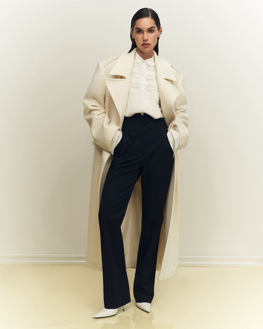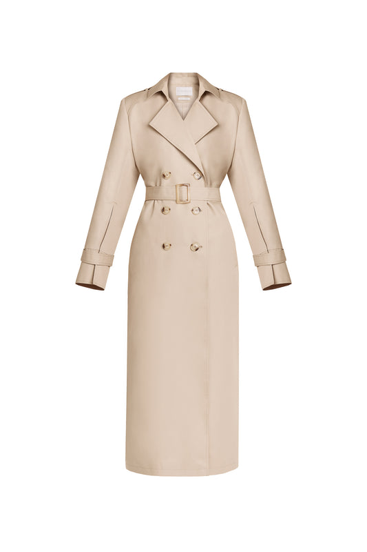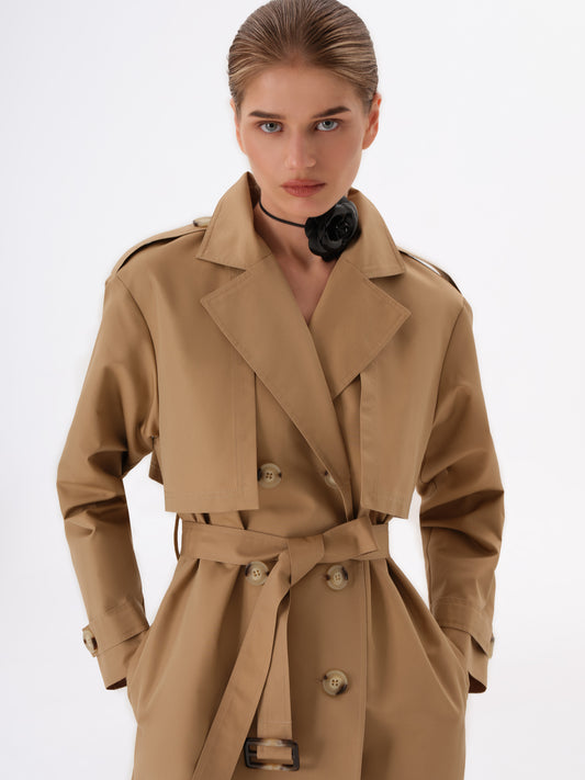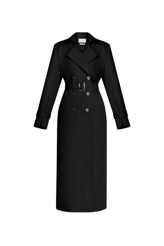 Double-breasted trench coat with voluminous shoulders