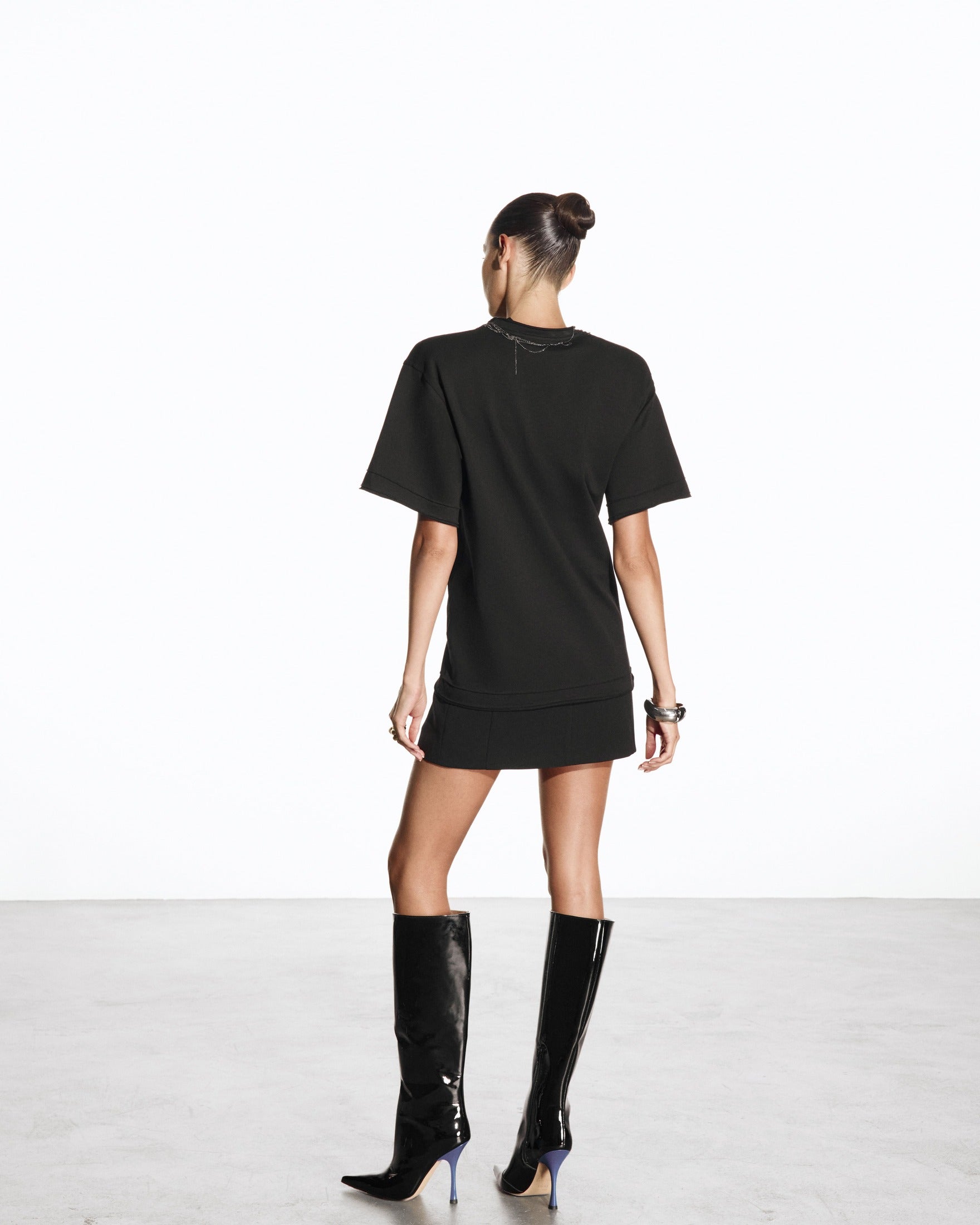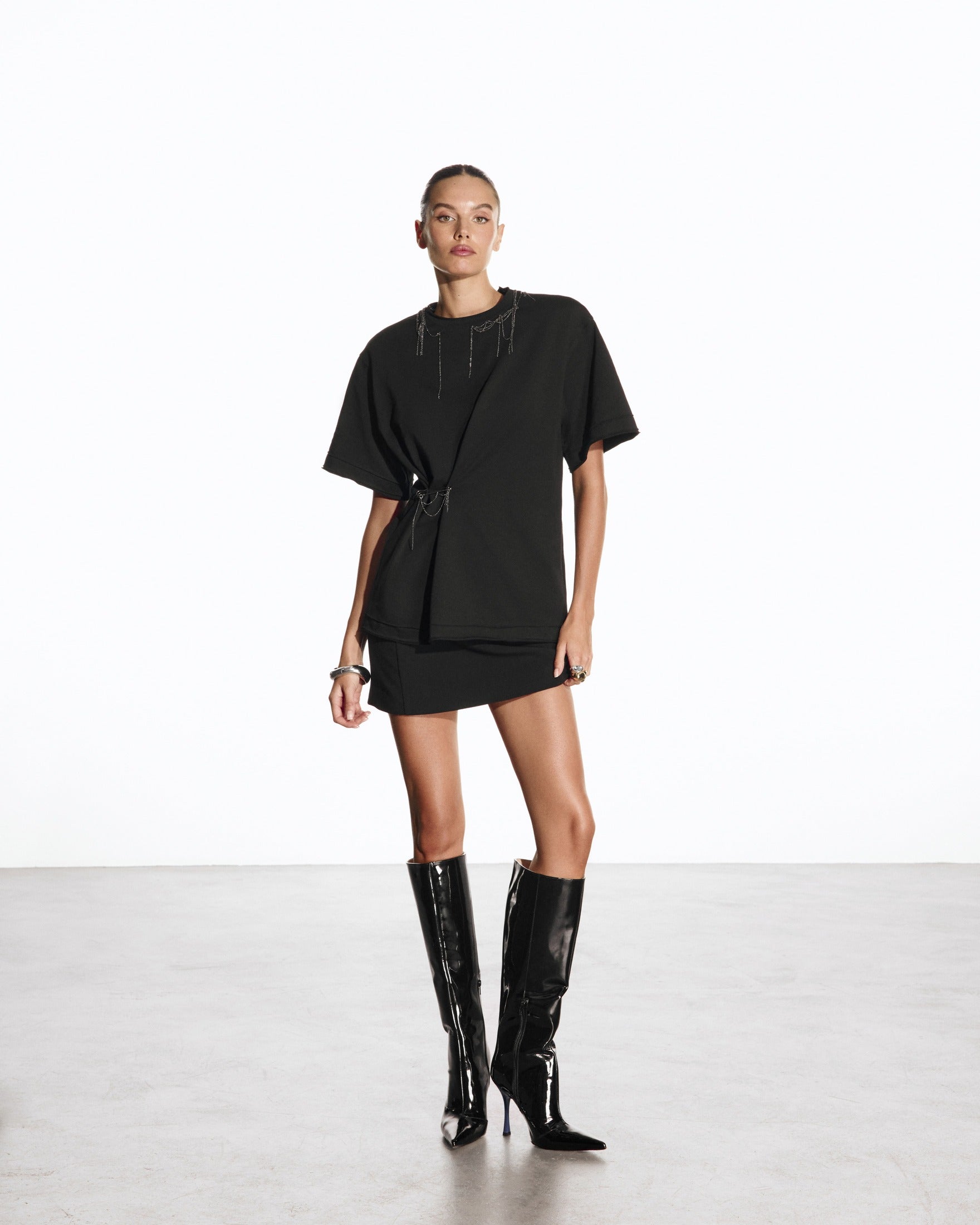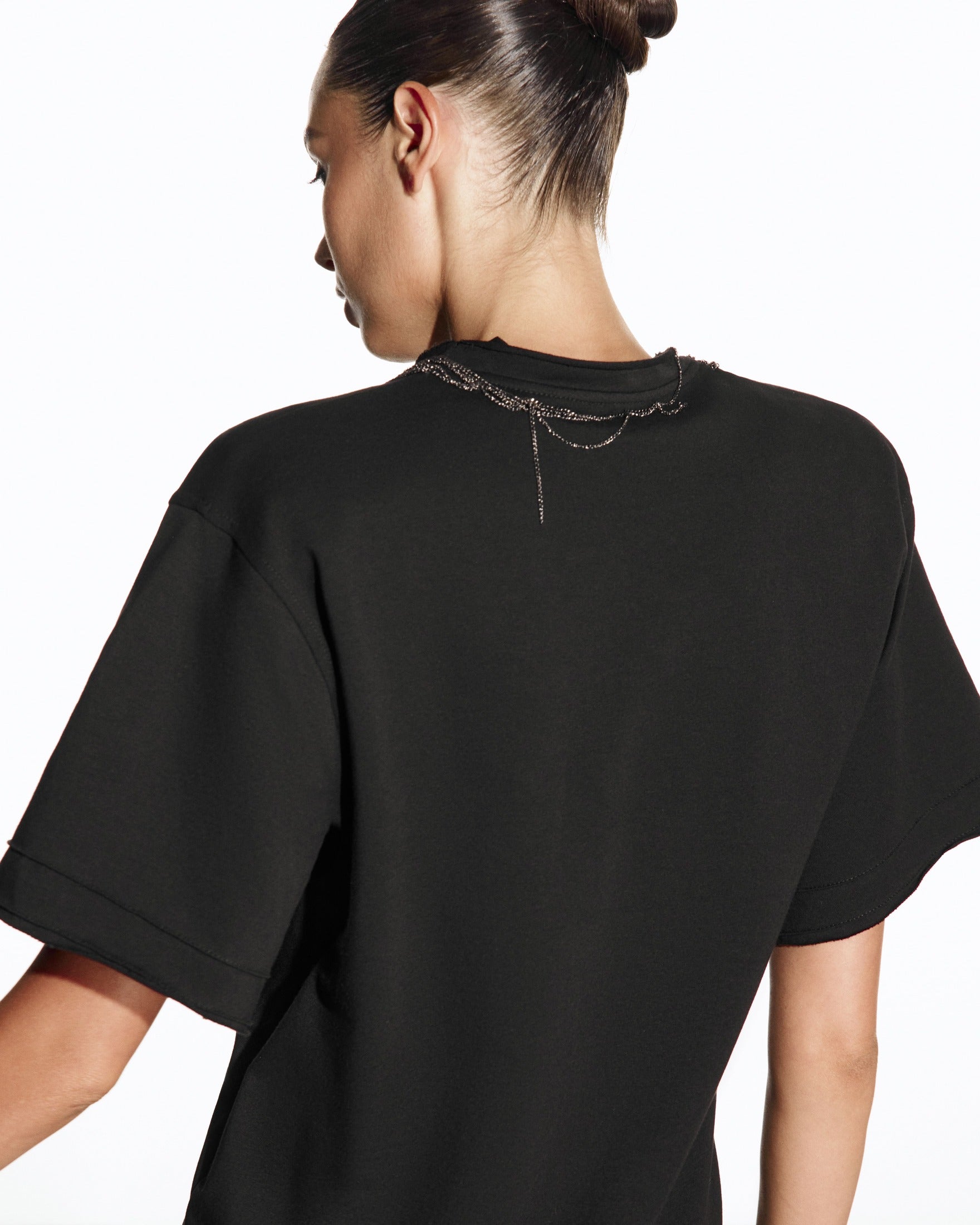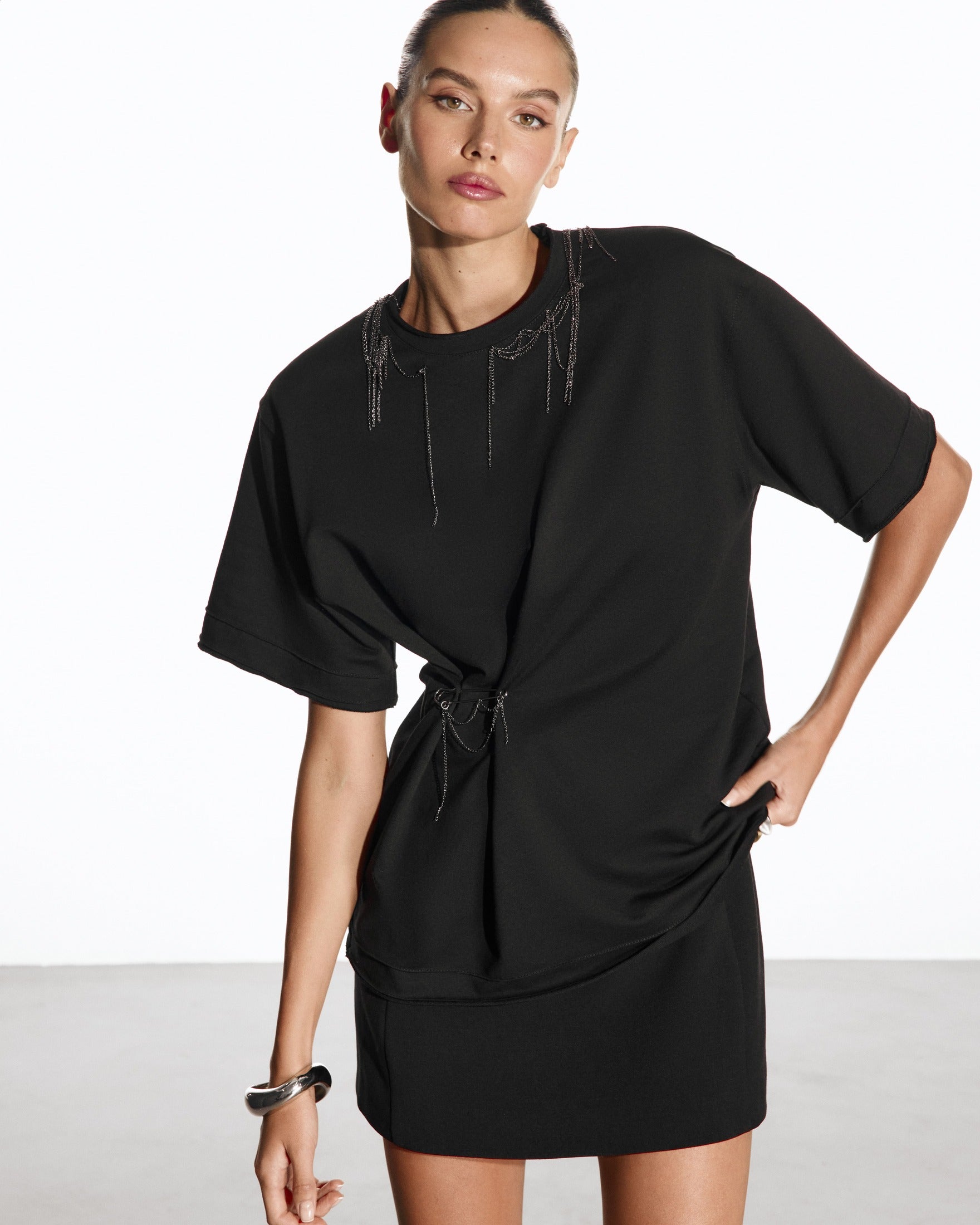 T-shirt made from premium Italian cotton for a comfortable fit. The distinctive voluminous shoulders are complemented by accent metal chains, giving you a unique and edgy look. This T-shirt features a round neckline also adorned with metal chains, and a removable pin for added versatility. The raw edges and removable shoulder pads allow you to customize your style, while the T-shirt retains its shape over time thanks to our handmade metal elements. Elevate your wardrobe with this statement piece created within one day.
