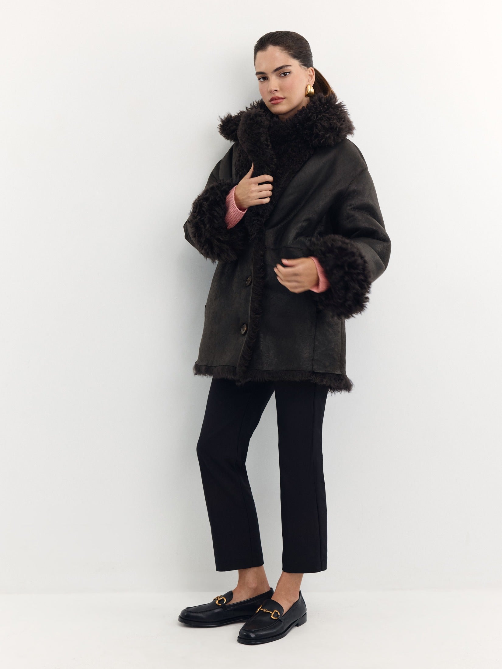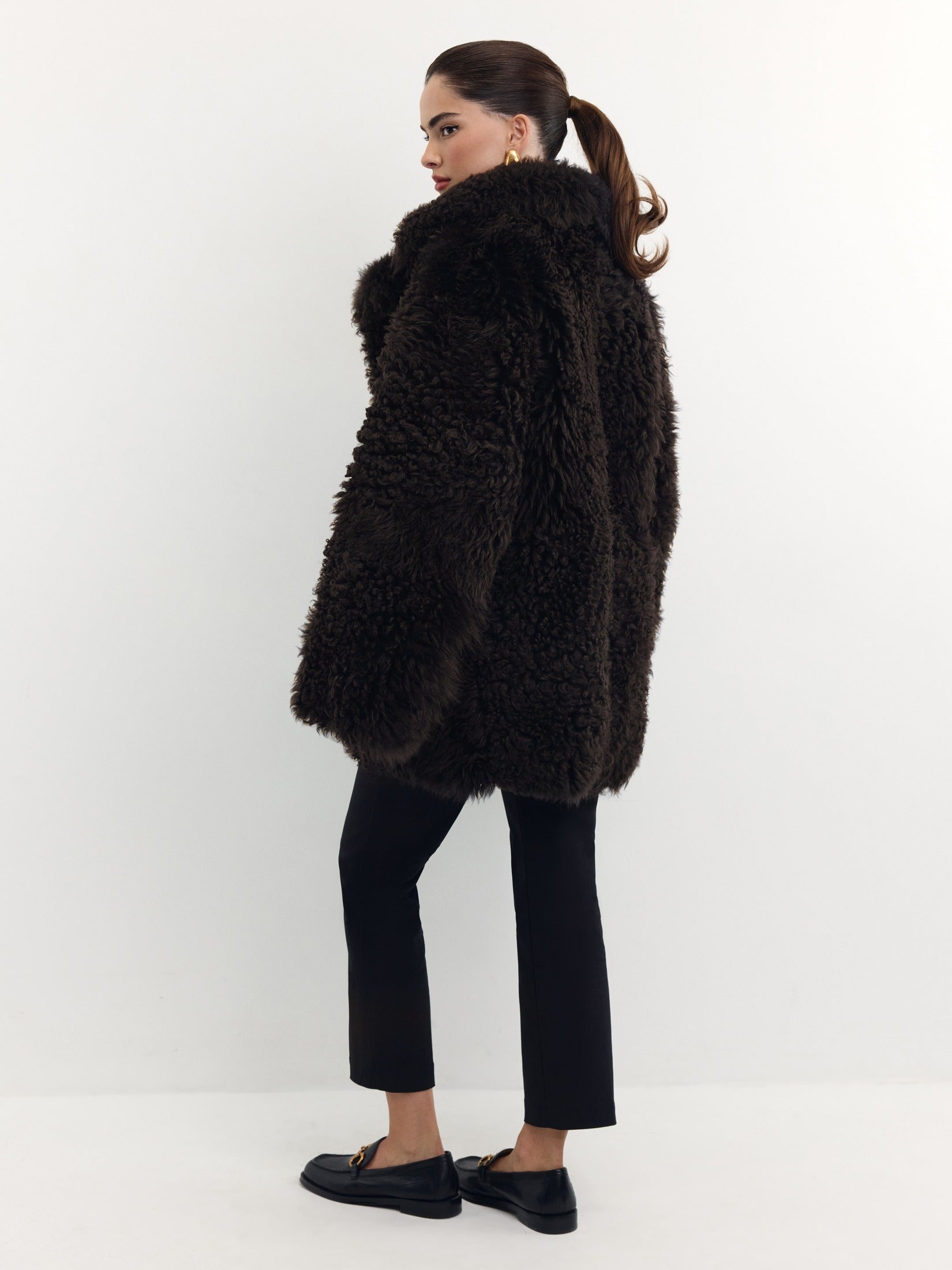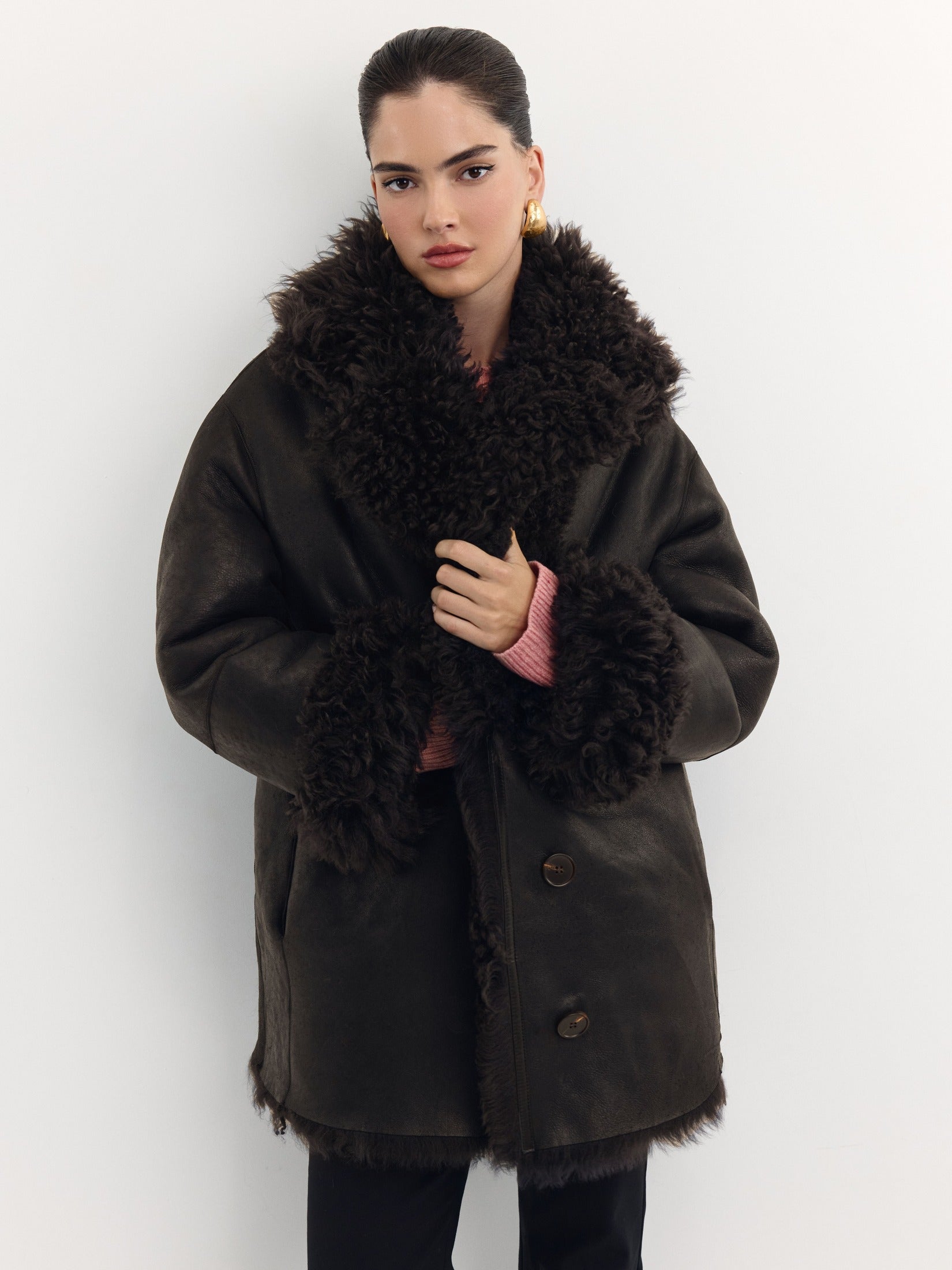 This limited edition double-sided sheepskin coat in a rich chocolate shade is crafted from Tigrado fur, known for its fine wool, long hair, and distinctive curls. Designed to retain its shape and volume over time, it offers lasting style and practicality. The versatile straight silhouette features a dropped shoulder line, spacious pockets, and an English collar. Wear it with either the fur or leather side outward, each revealing a unique look. The coat closes with buttons and includes a removable two-sided belt for added fit options. Suitable for temperatures down to -35°C, it ensures warmth in harsh winters.