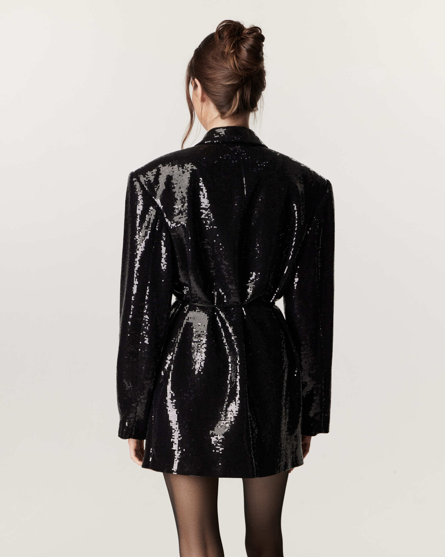 Introducing our Dress-jacket Paillette, the ultimate statement piece for any occasion. Made with high-quality Italian blended fabric, its miniature sequins give off a glossy shimmer with every move. Structured with shoulder pads and an English collar, this mini-length jacket dress exudes elegance. Complete the look with the included Piuma chain belt and add a clutch for a sophisticated touch.