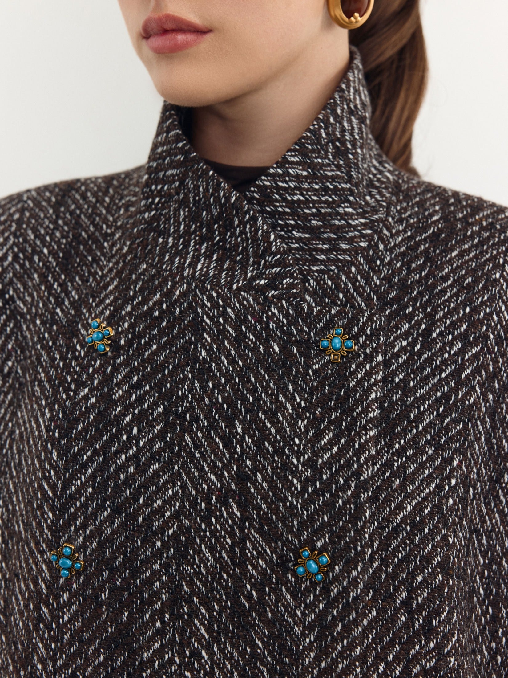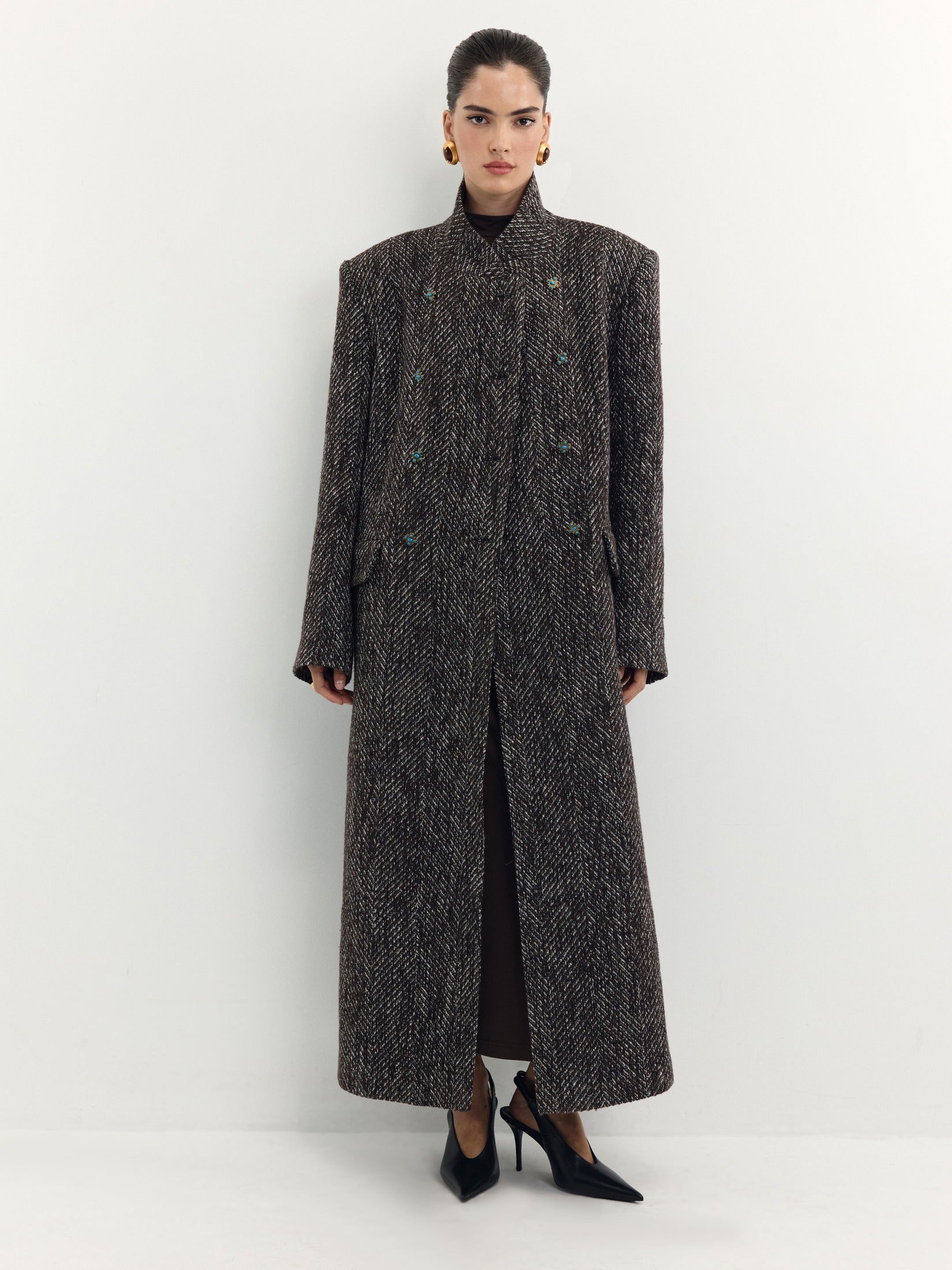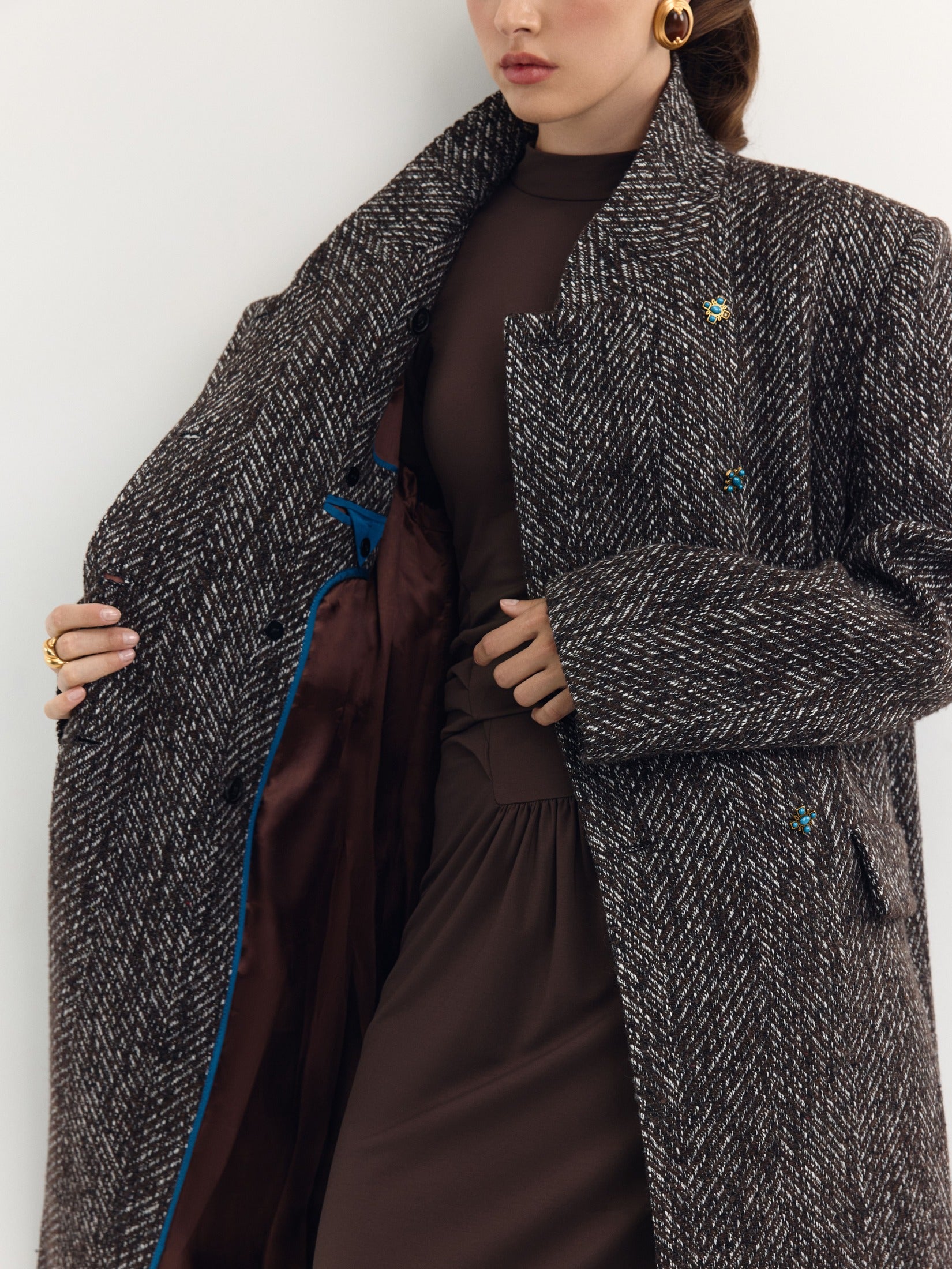 Crafted from 100% Italian wool with a distinctive herringbone pattern, the Felicita Coat showcases a deep brown hue highlighted by white accents that enhance its textured fabric. Its voluminous silhouette and defined shoulder line create a refined, graphic profile, while the stand collar offers wind protection with a snug fit. The double-breasted closure features aged gold metal buttons adorned with turquoise details. Practical slanted hip pockets with flaps complement the design. Inside, a viscose lining, stone-colored trim, and a concealed frame pocket provide thoughtful finishing touches.