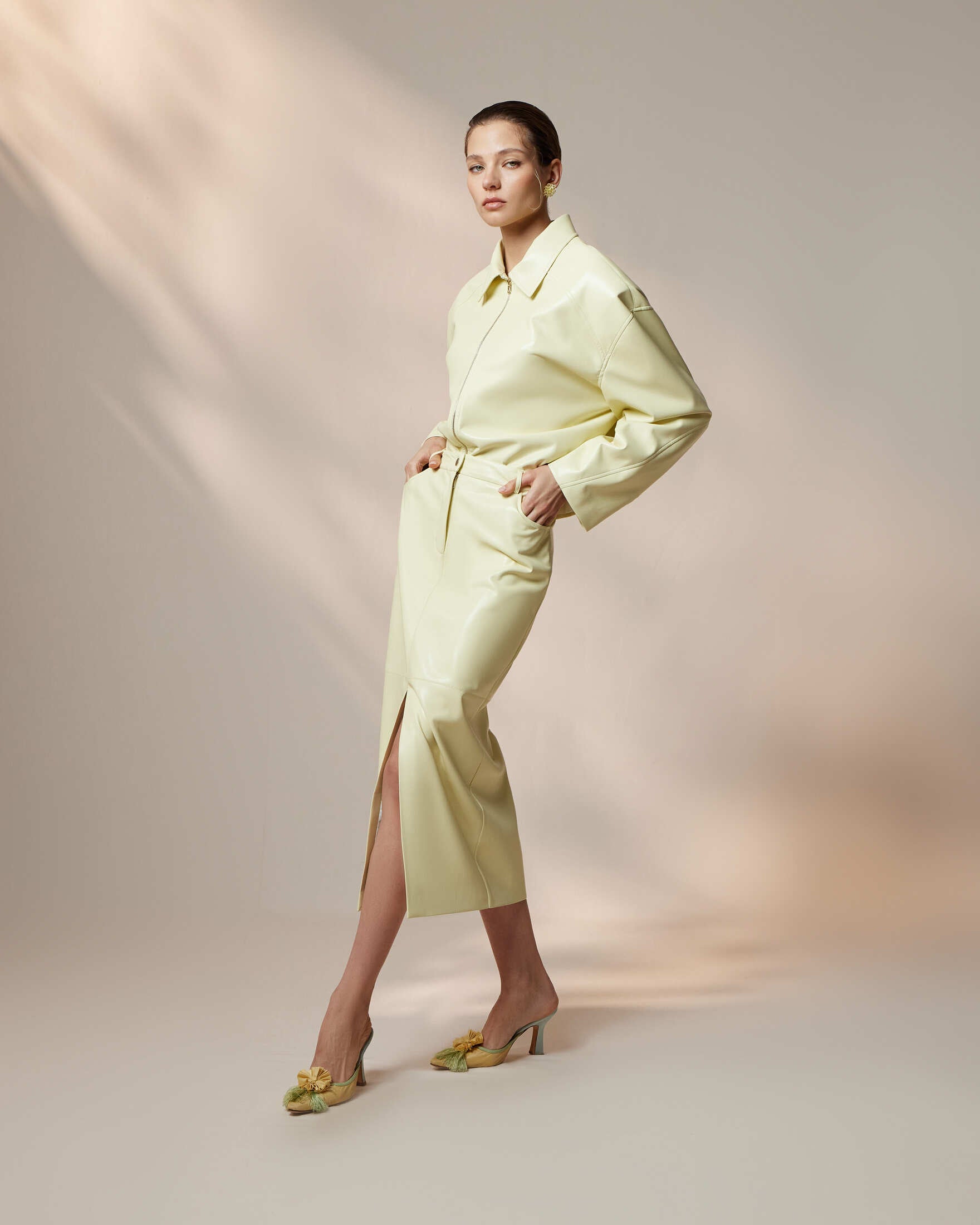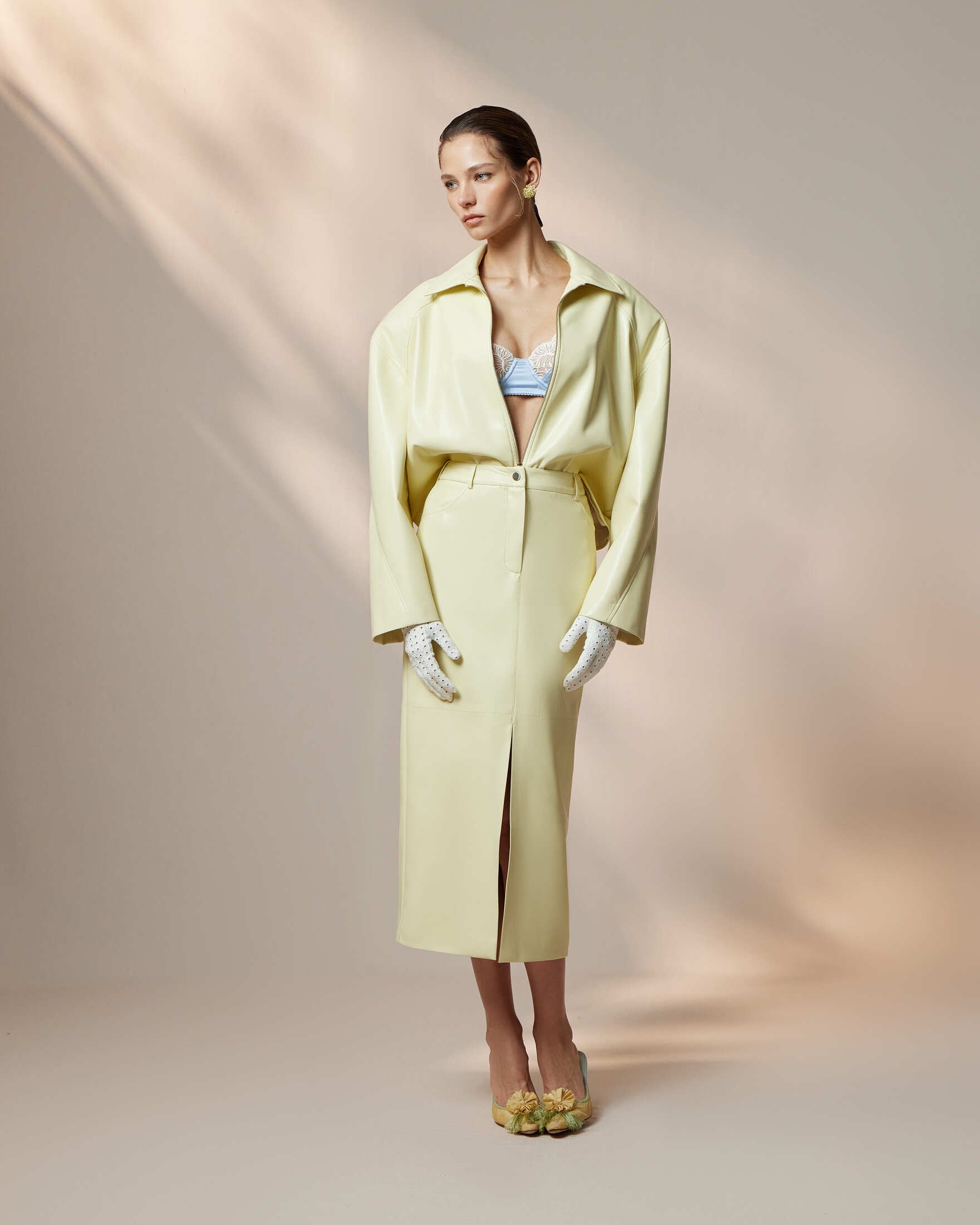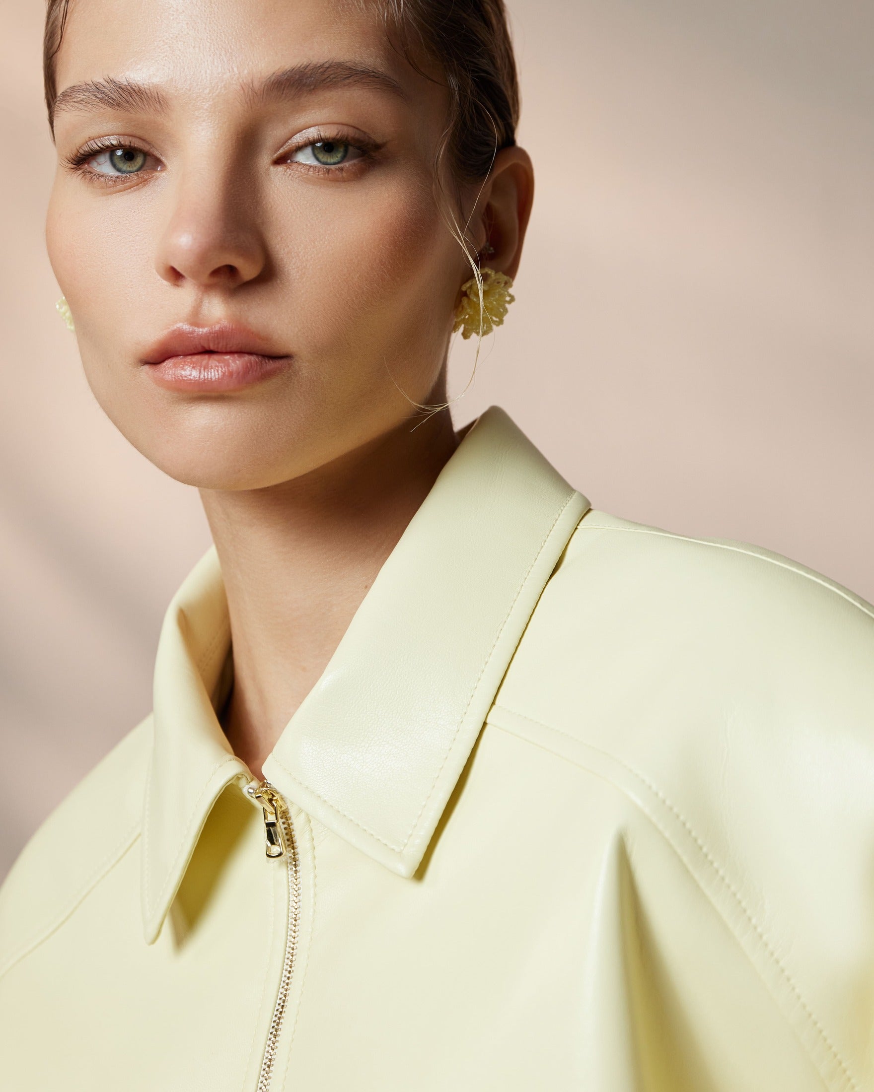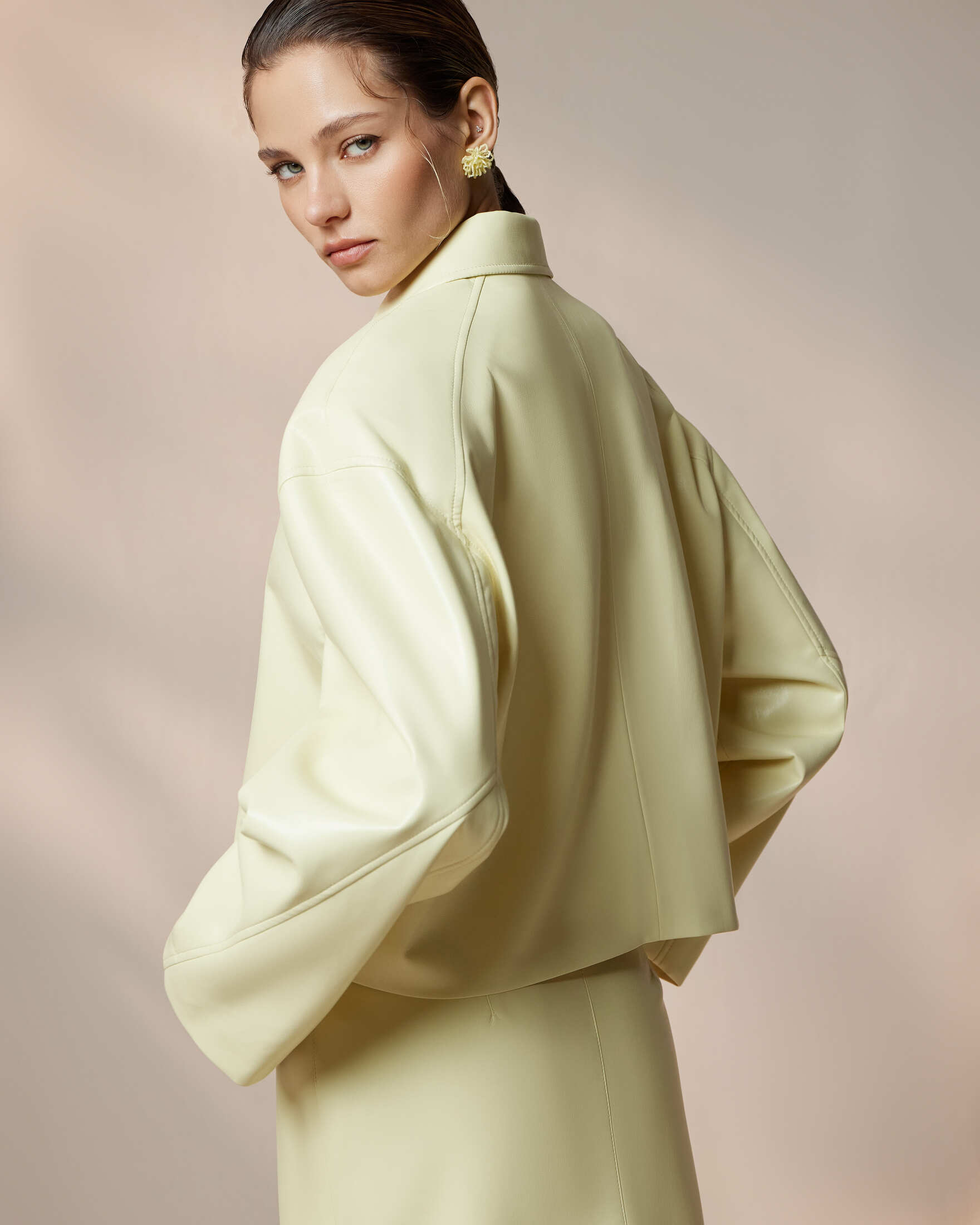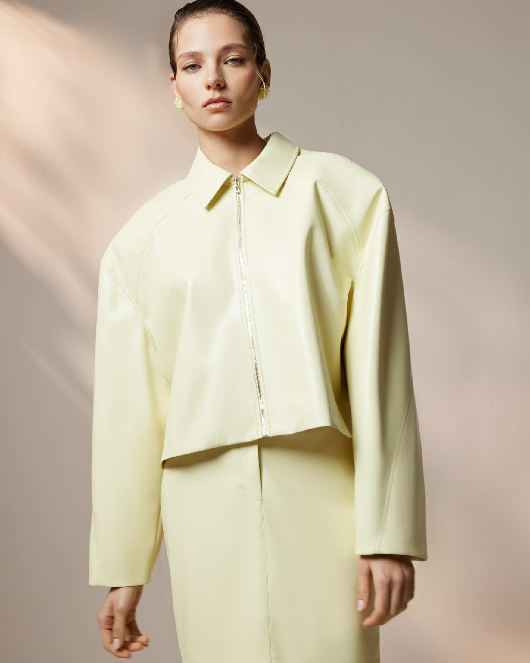 Introducing the Golden Jade eco-leather jacket, made from the softest Italian leather in a delicate lemon shade. Its accent shoulder line and extended sleeves create a unique silhouette, while the cropped cut and stand-up collar add a touch of style. With color-matched stitching and a metal zipper, this jacket is a perfect addition to your wardrobe. Pair it with the matching skirt for a complete look.