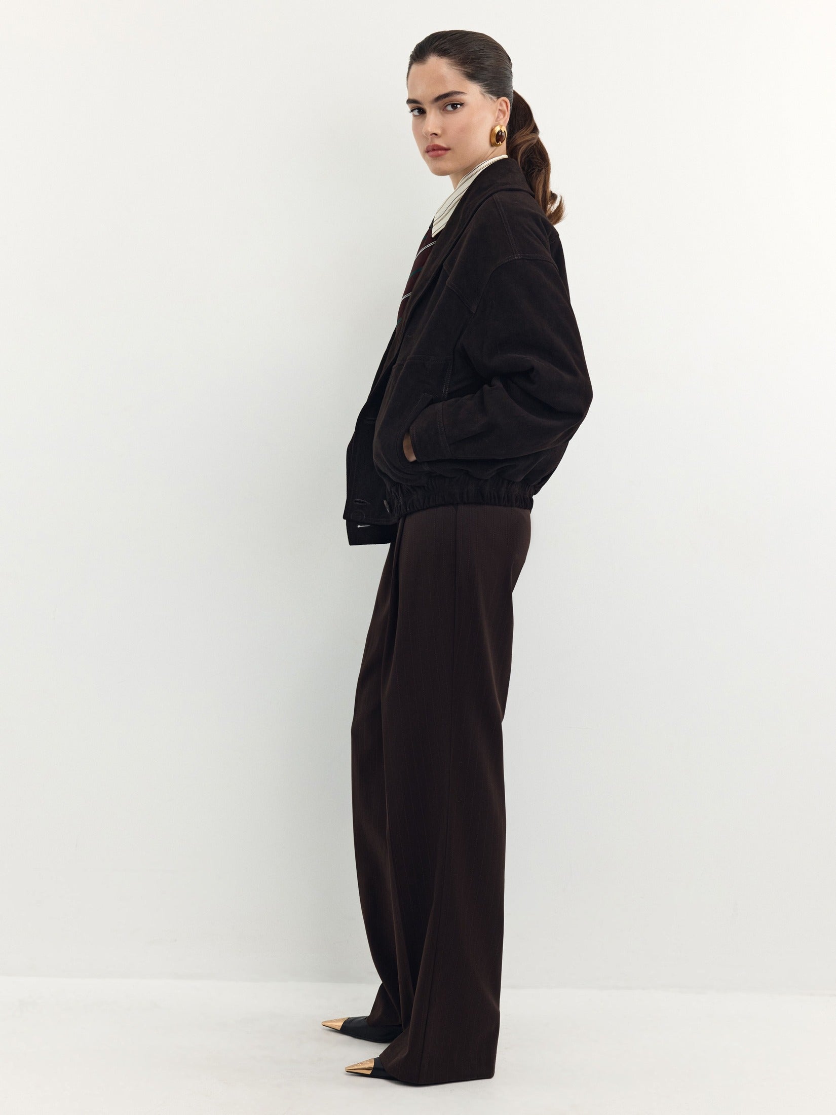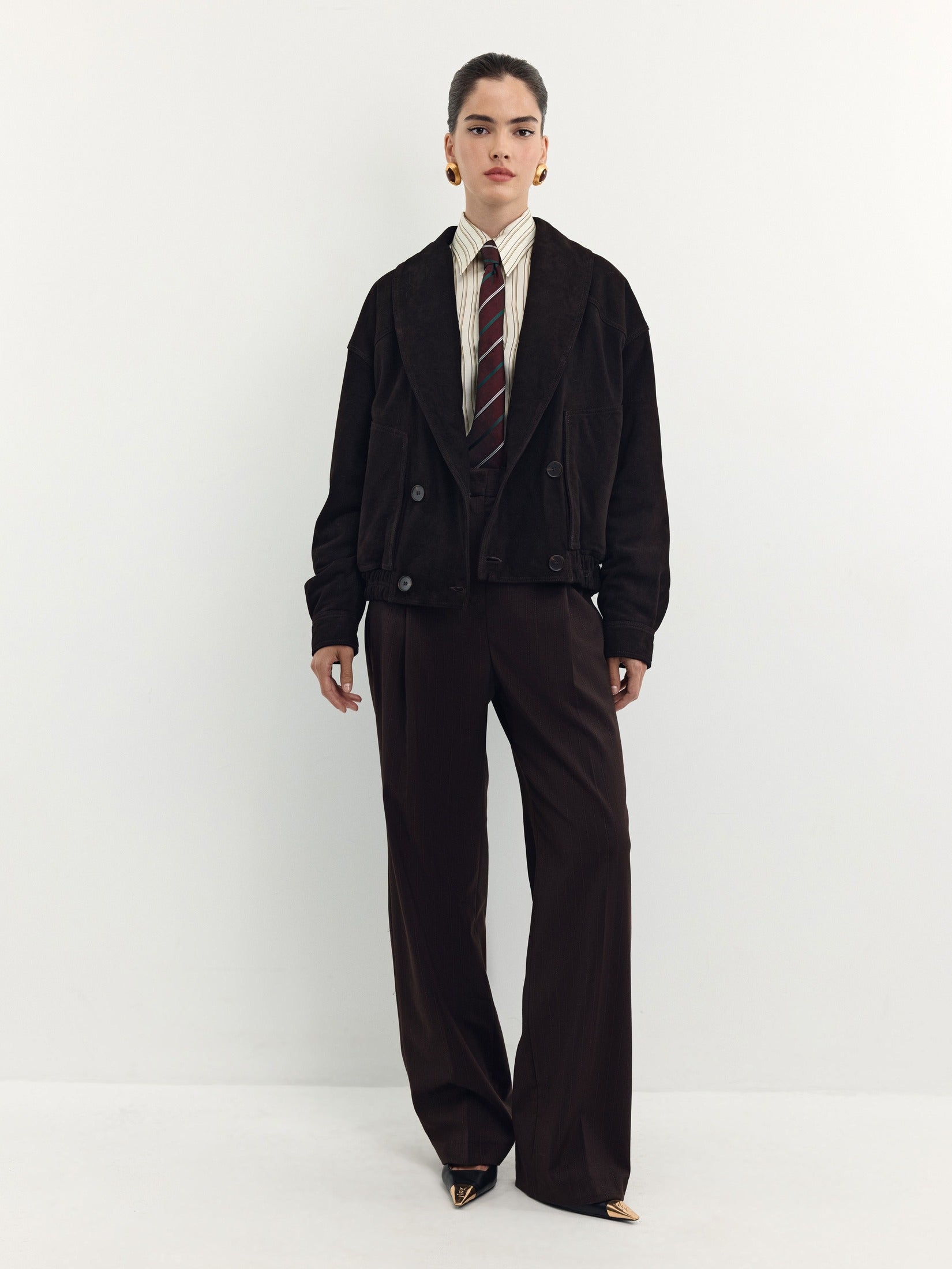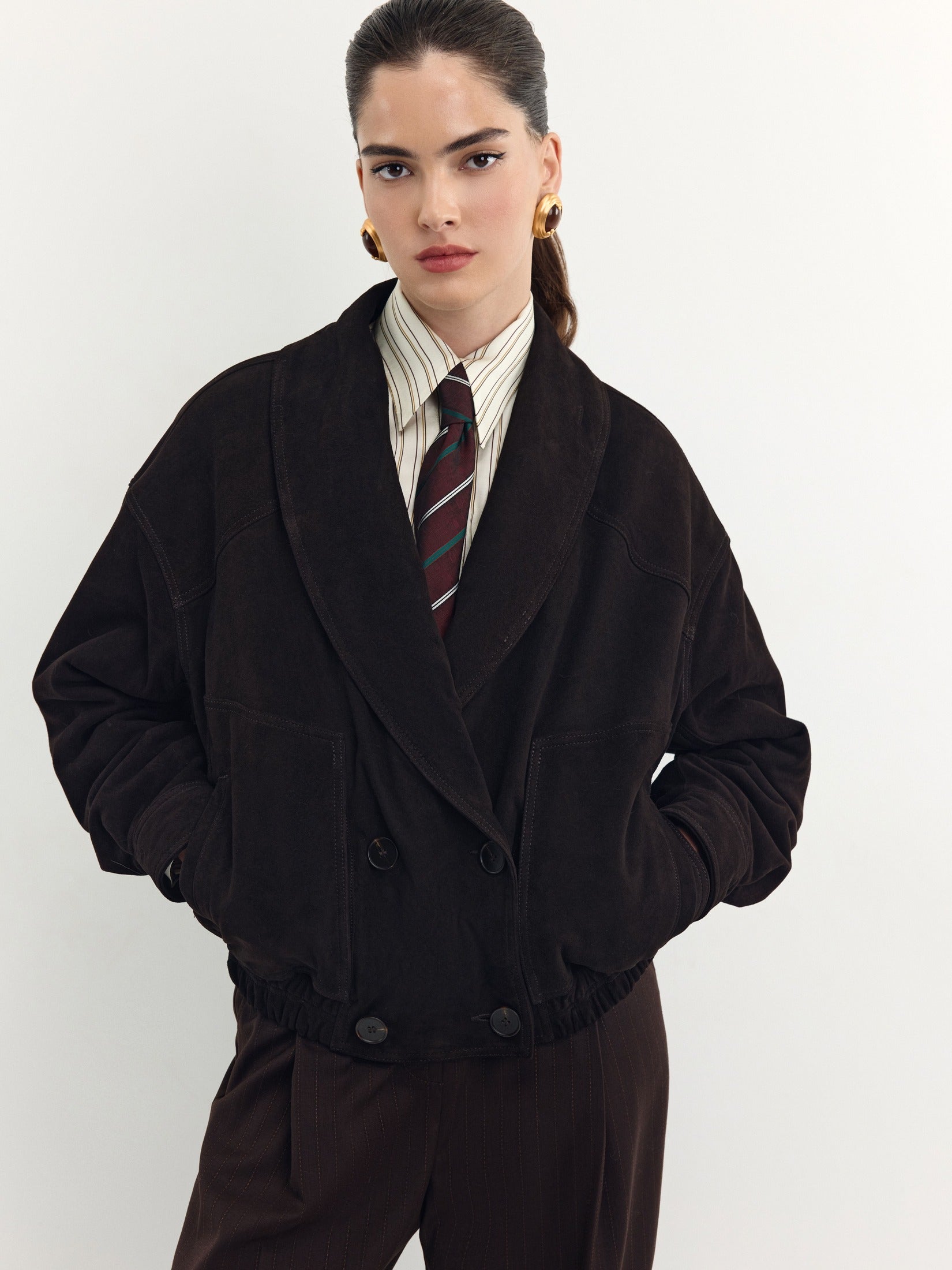 This insulated jacket features genuine sheepskin suede in a rich brown tone, combining luxury with warmth. Its shawl collar can be raised and secured with a hidden magnetic button to protect the neck and chest from cold. A stitched belt with an elastic band ensures a stable fit at the hem. The jacket includes dual-entry patch pockets insulated with lightweight, zone-specific Shelter material for targeted warmth. Fully lined to complement the suede, it offers a reversible design, fastening on either side for versatile, unisex wear.
