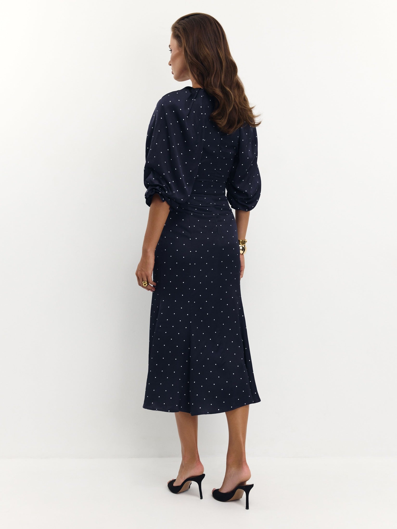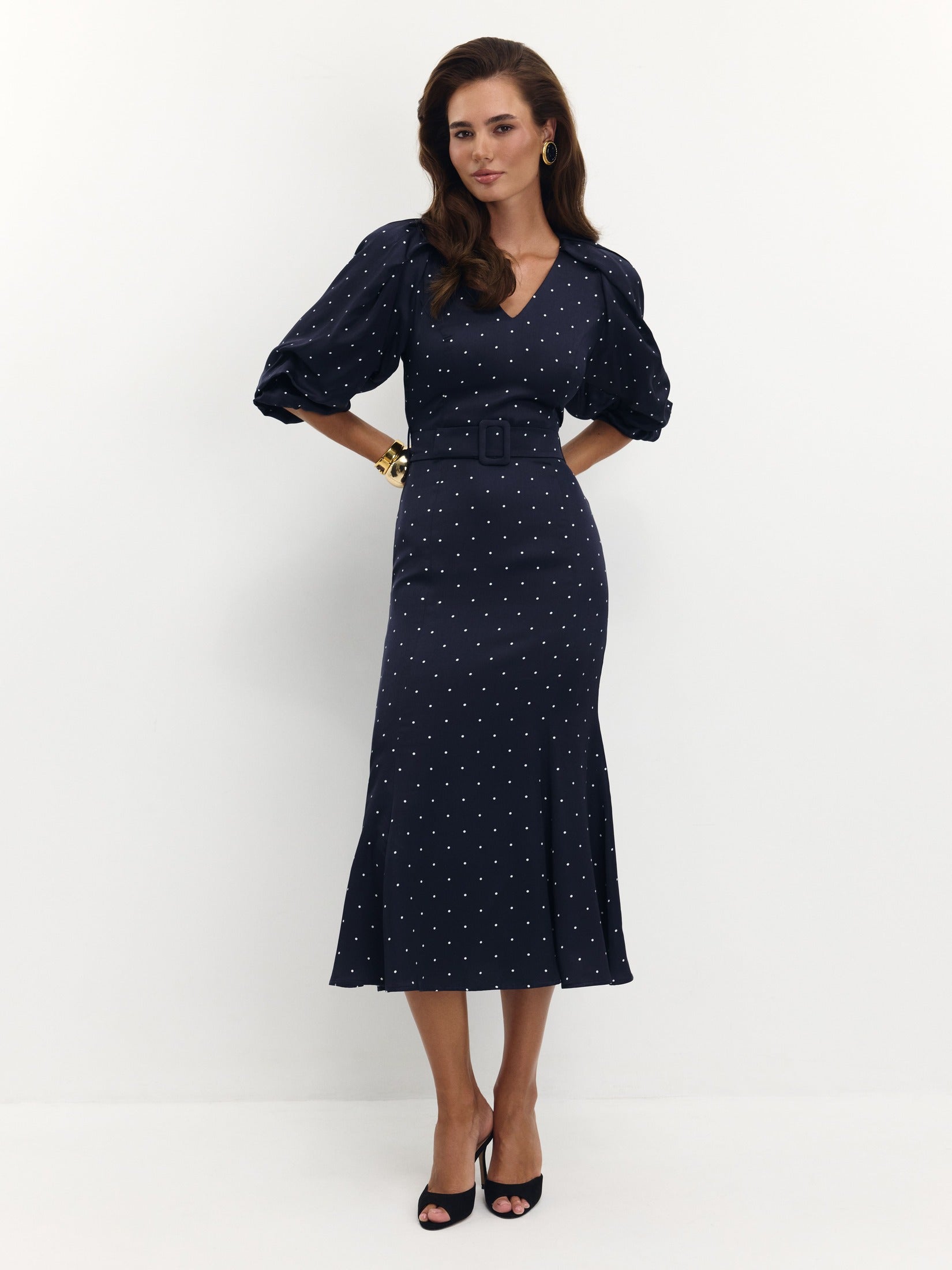 The Notte Stellata Dress features a fitted silhouette crafted from deep navy satin viscose with a unique polka-dot print designed exclusively for this collection and printed in Italy. Its V-neckline elongates the neckline and overall silhouette, while soft folds and shoulder pads enhance the shoulder line. Voluminous elbow-length sleeves with pleated details add an airy, expressive touch. The waist is defined by a belt with a tight buckle, and the gode skirt flares smoothly along vertical design lines, combining elegance with refined movement.