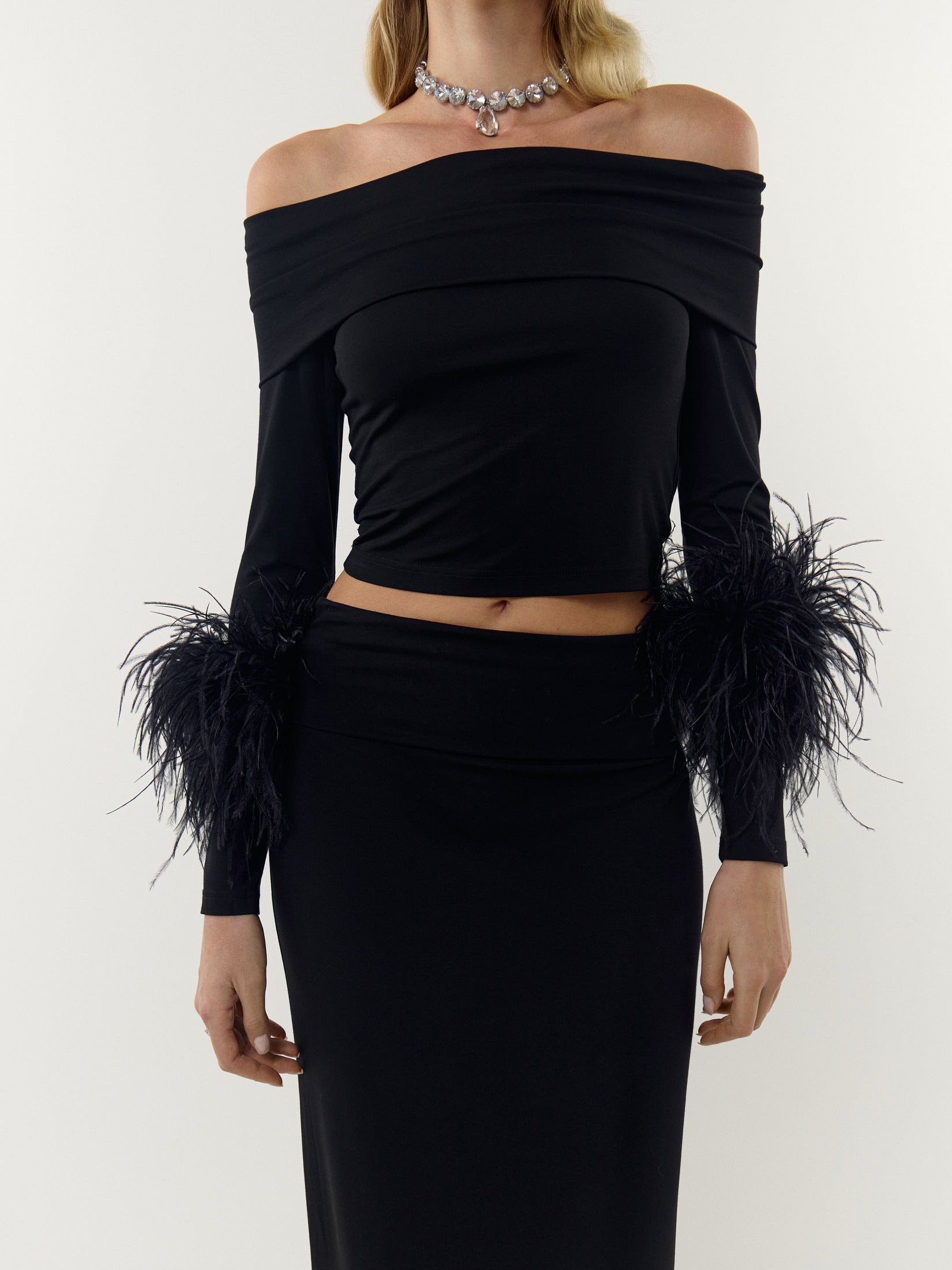 The Piuma Knitting Set combines Italian viscose craftsmanship with theatrical elegance. This two-piece ensemble features a fitted long-sleeved crop top with a double-folded neckline that frames the shoulders with refined sophistication. The standout detail—hand-painted ostrich feather boas adorning the elongated sleeves—adds movement and drama, secured with discreet button fastenings. The coordinating maxi skirt, crafted from Italian viscose knitwear, features a double turn-back waistband for secure comfort and a semi-fitted silhouette that drapes gracefully with wear. The high-cut design and fluid fabric create an elongated, elegant line. Together, these pieces form a distinctive set designed for those seeking statement-making sophistication.