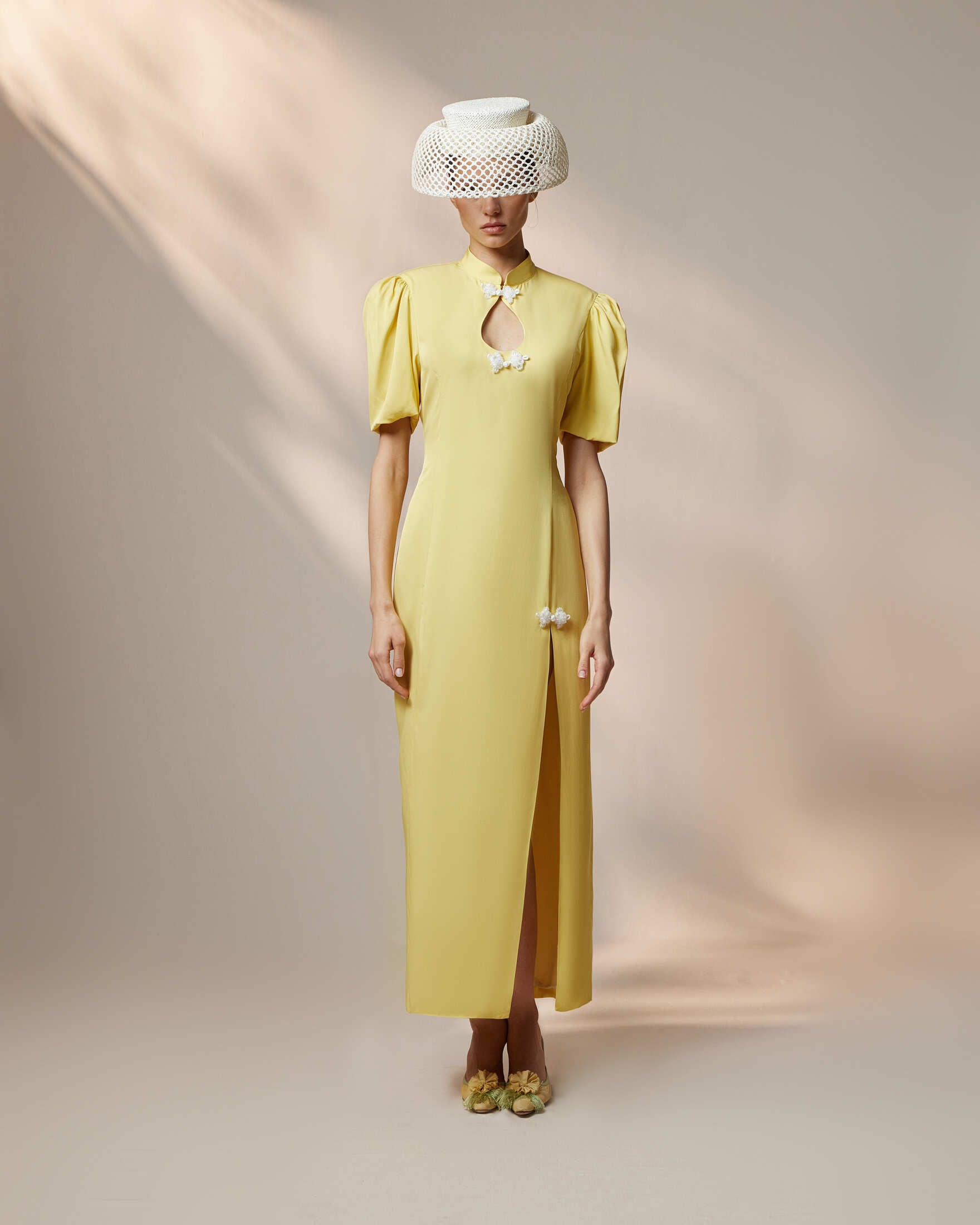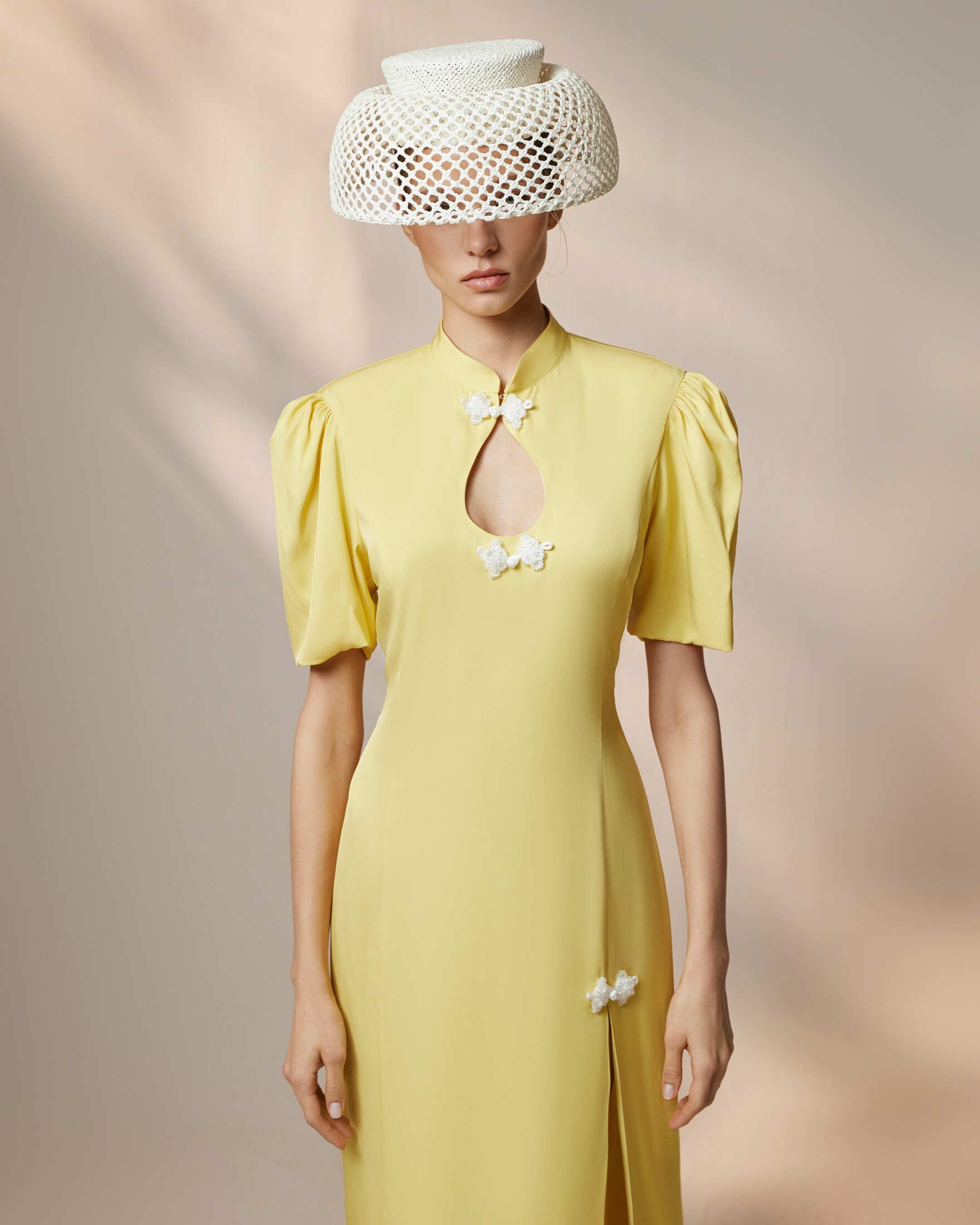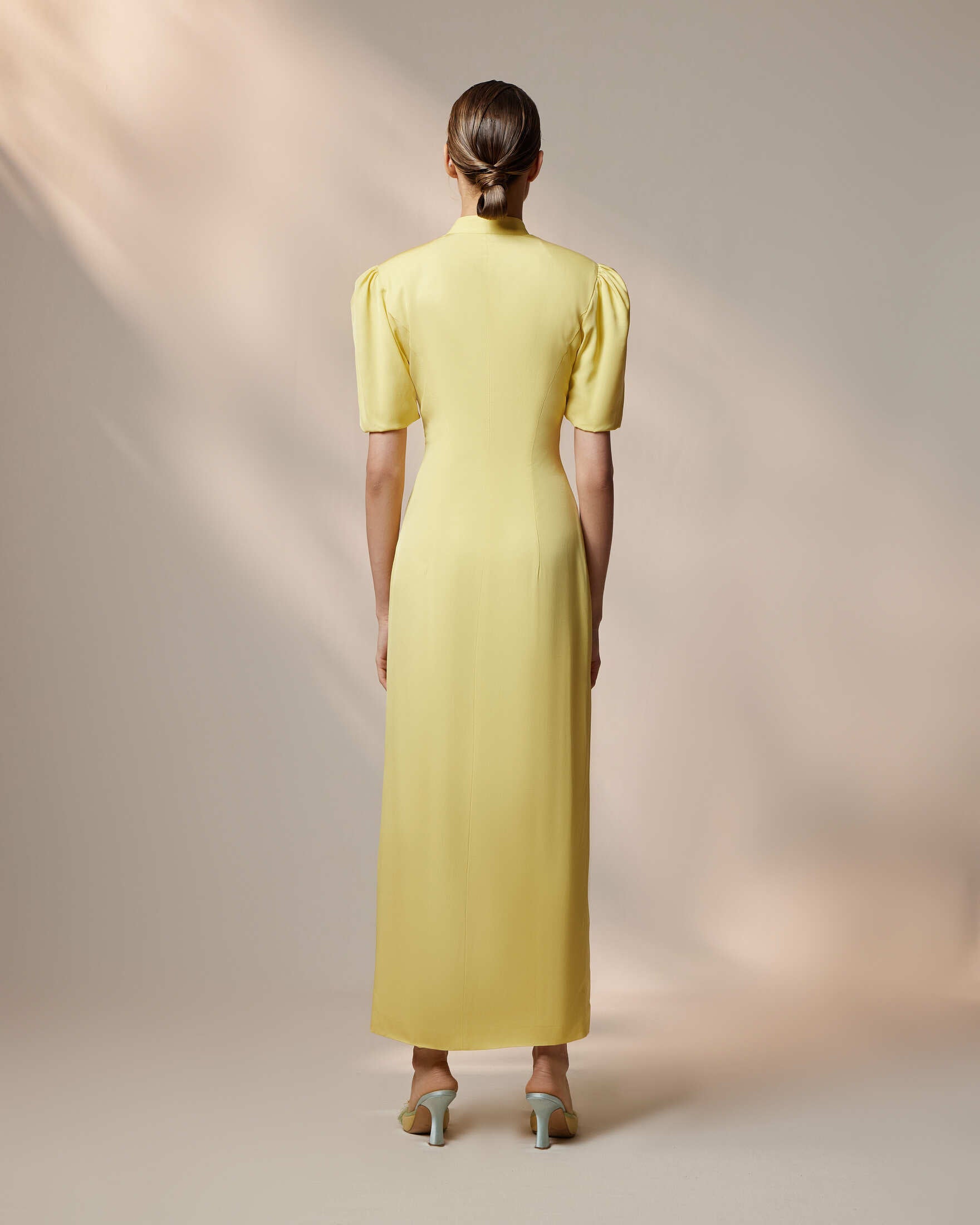 This Italian viscose maxi dress in tweed weave features a unique drop neckline and voluminous sleeves for an elegant look. The fitted silhouette is complemented by a delicate cutout on the leg. Made to order with handmade clasp fasteners and a weightless chiffon lining.