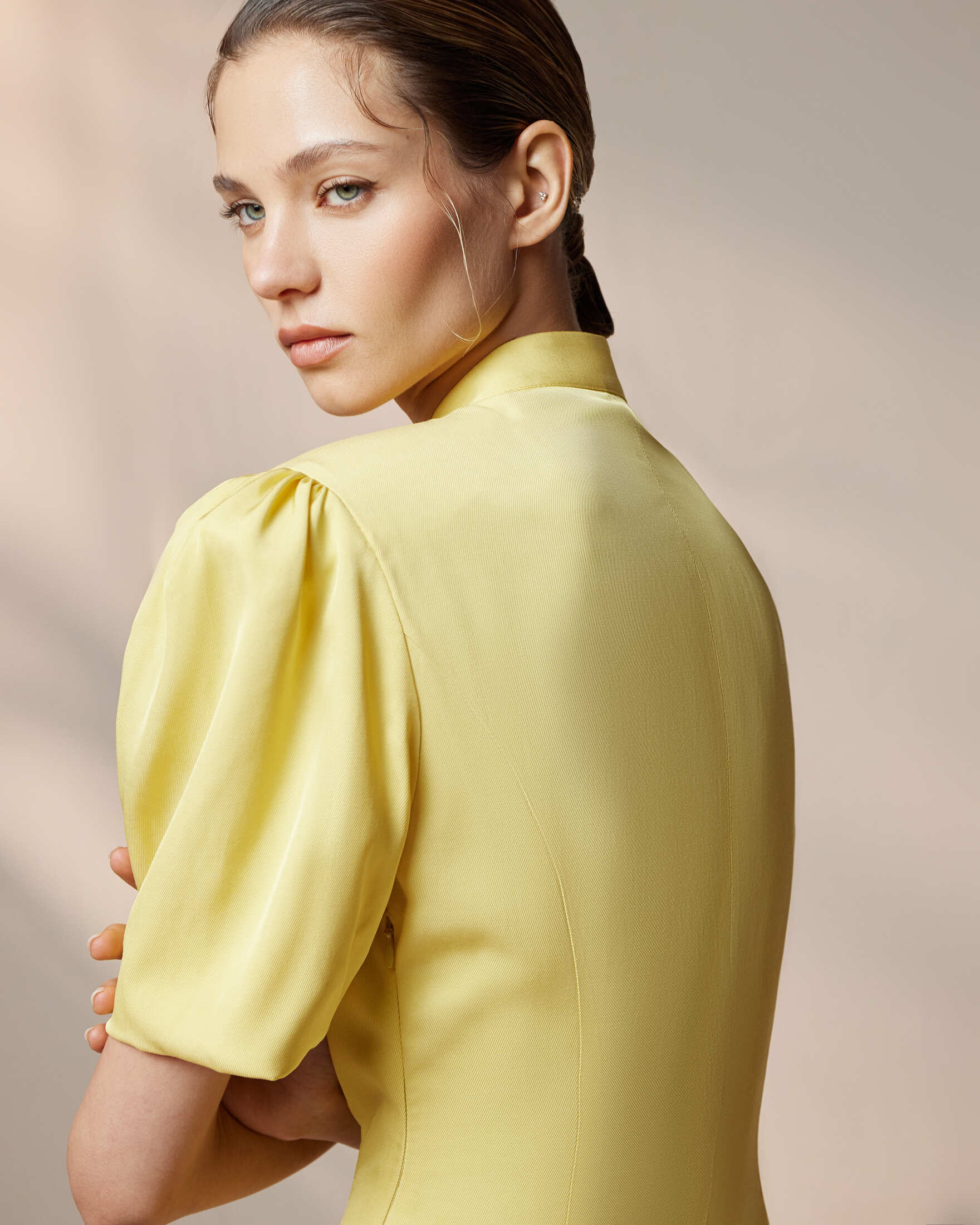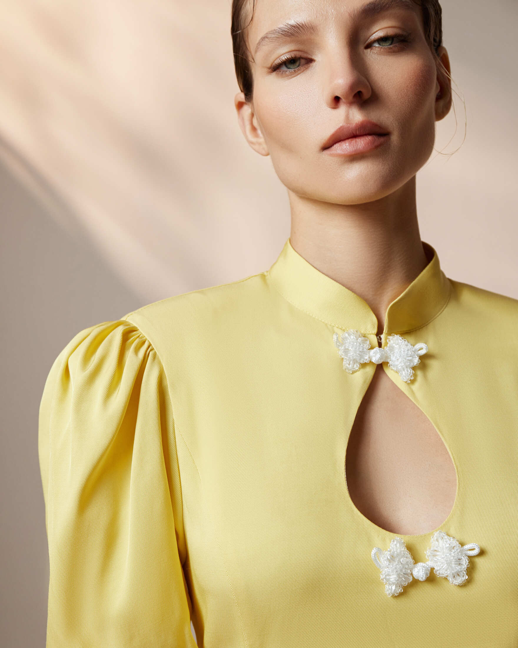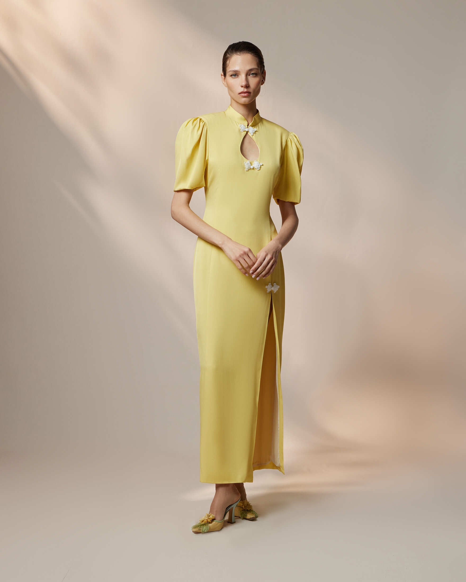 This Italian viscose maxi dress in tweed weave features a unique drop neckline and voluminous sleeves for an elegant look. The fitted silhouette is complemented by a delicate cutout on the leg. Made to order with handmade clasp fasteners and a weightless chiffon lining.